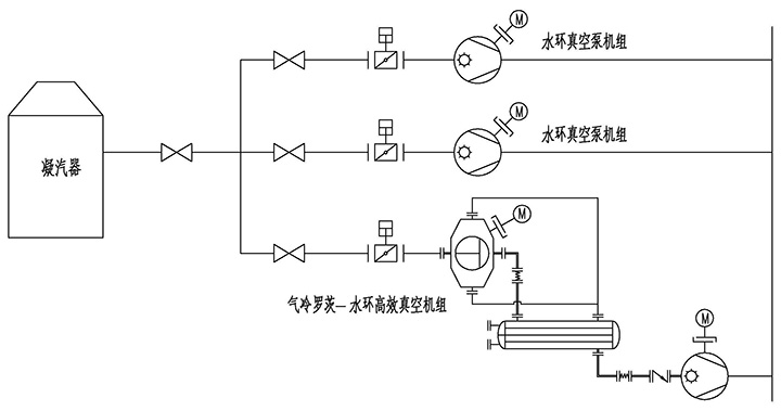 不改變原水環(huán)式抽真空系統(tǒng)的設(shè)備及功能,在抽真空主管道上并接一套羅茨水環(huán)高效真空機組。