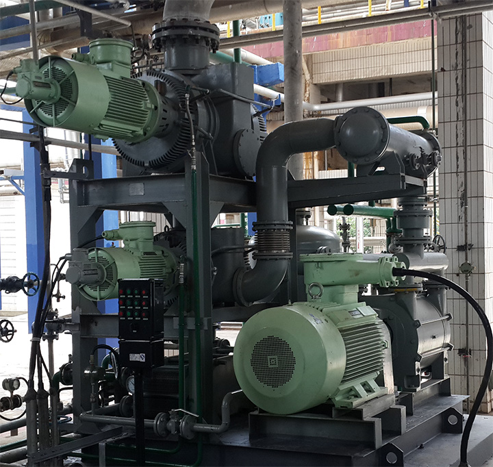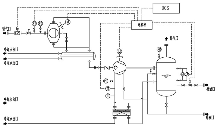 具體的思路為,不改變原裝置中的水環(huán)式抽真空系統(tǒng)的設(shè)備及功能,在抽真空主管道上并接一套羅茨水環(huán)高效真空機組。在機組啟動建立真空期間,首先由原裝置水環(huán)式抽真空系統(tǒng)進行快速預(yù)抽,以達到啟動真空,在正常運行保持真空階段,使用羅茨水環(huán)高效真空機組進行維持真空。
