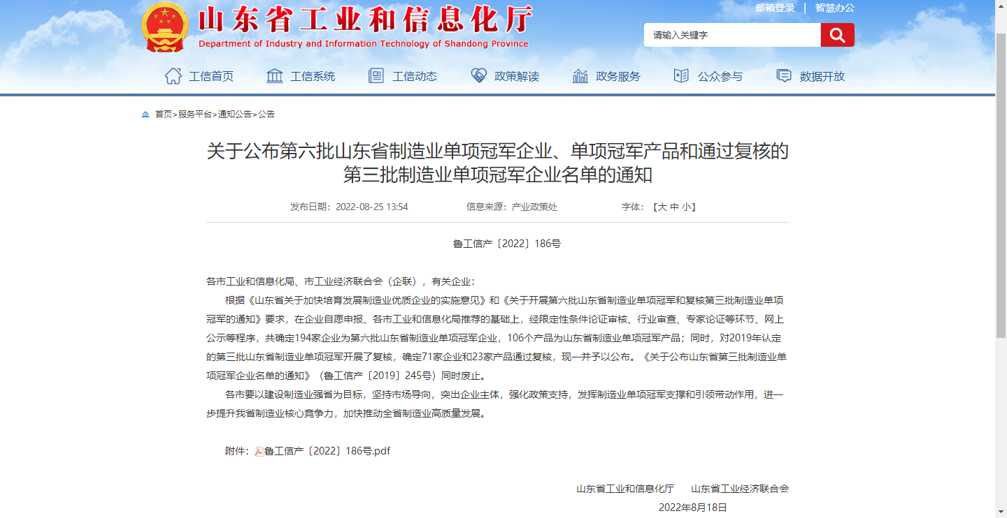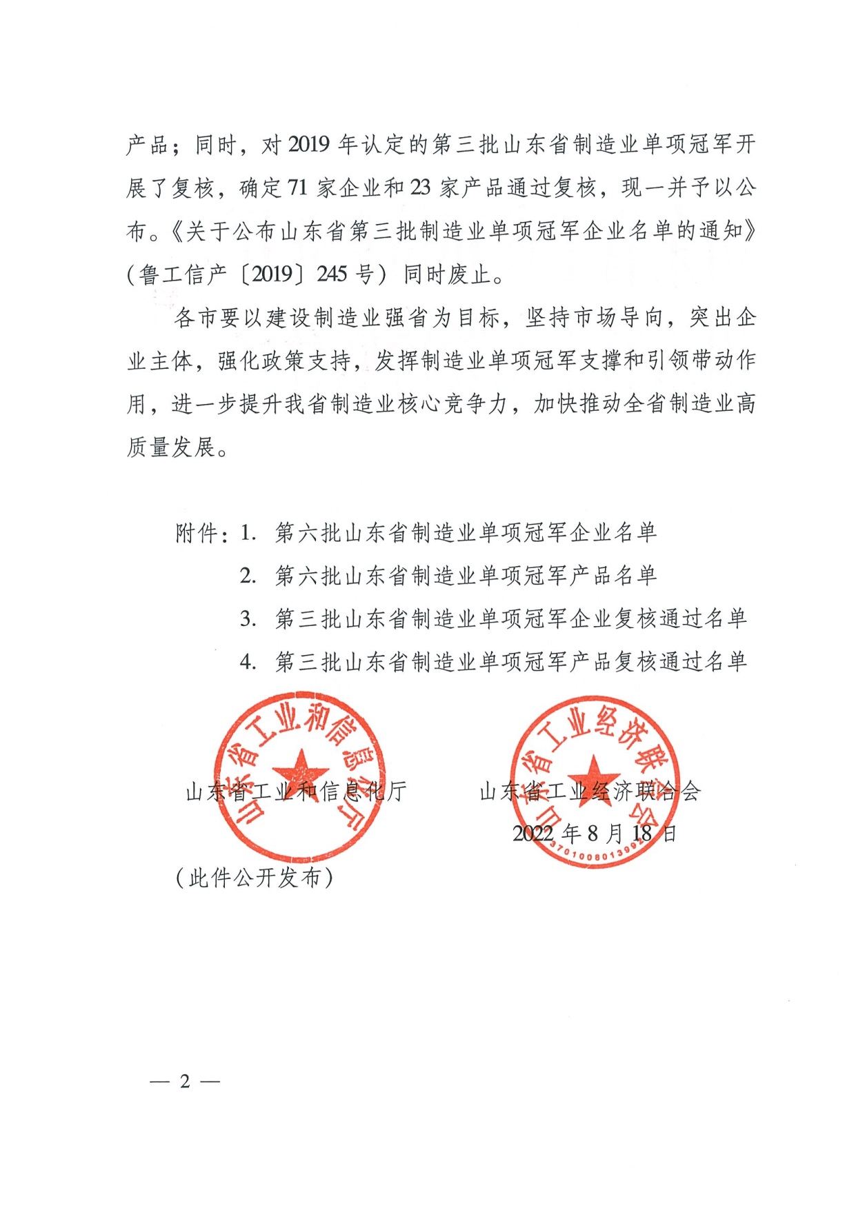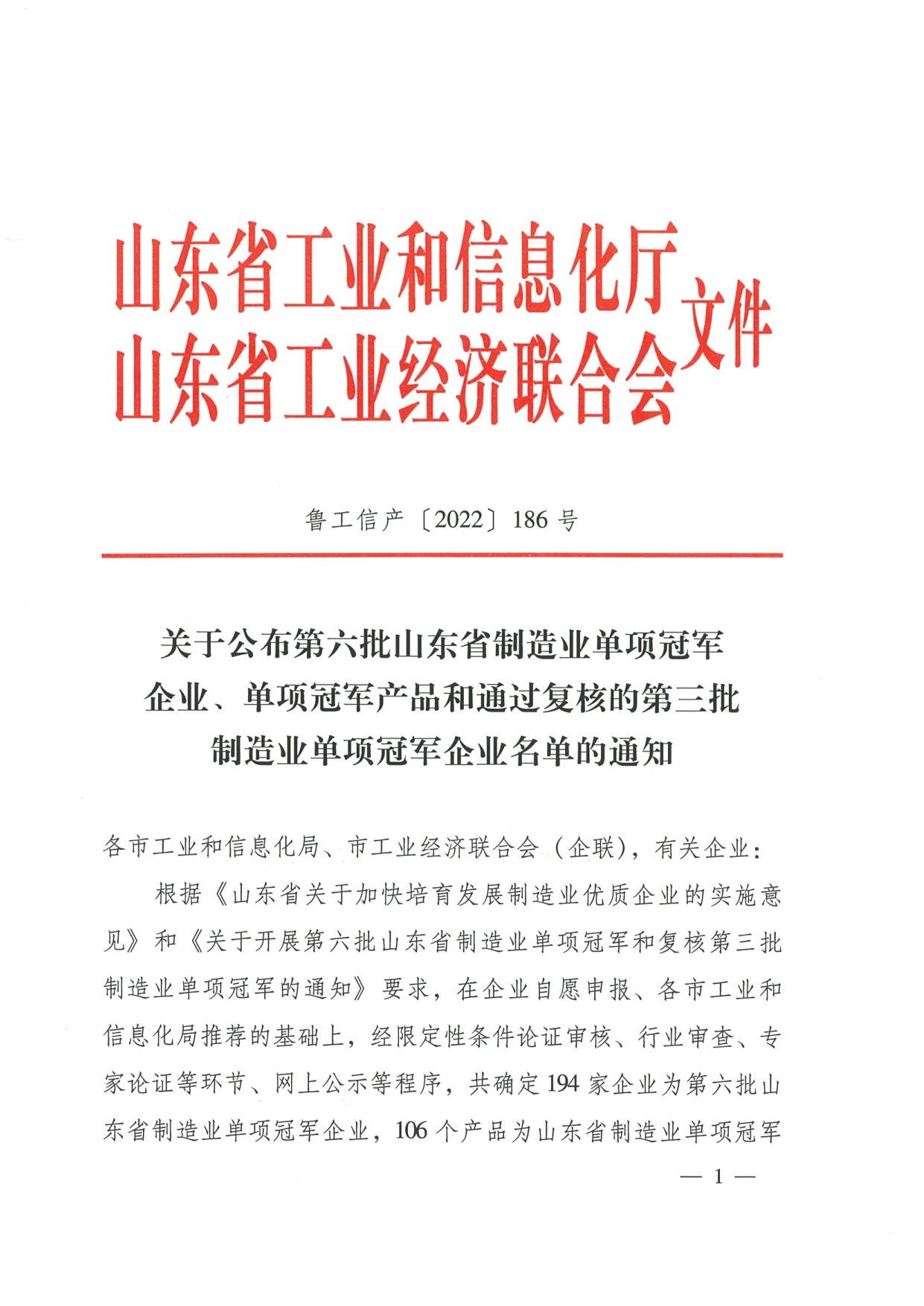 公司榮獲山東省制造業(yè)單項冠軍企業(yè)