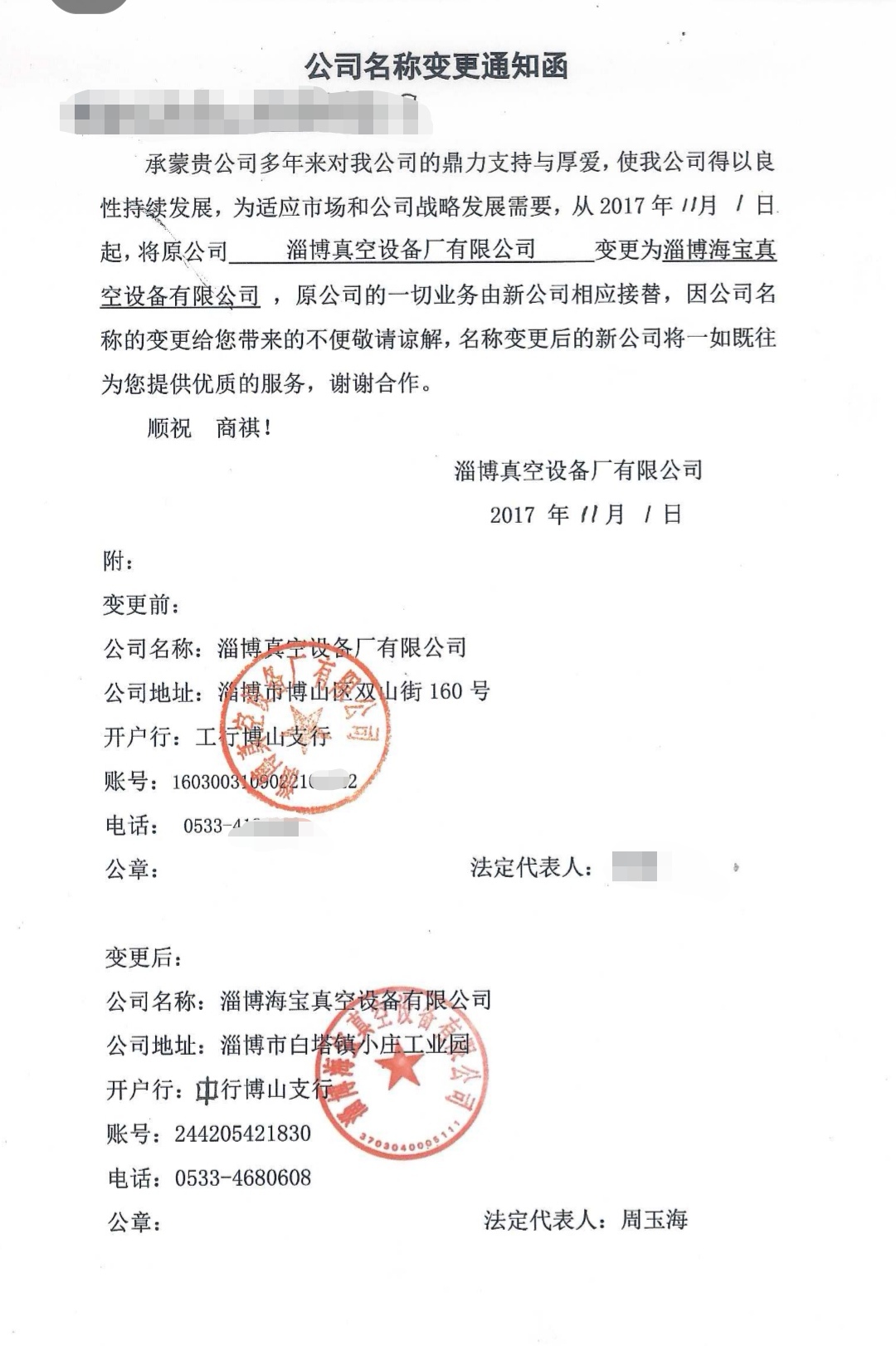 淄博海寶真空設(shè)備有限公司未經(jīng)我公司授權(quán),私自出具變更函,給客戶和我公司帶來了巨大影響,該變更函純屬海寶真空私自偽造,提醒廣大用戶接收到類似變更函,一定要先與我公司核實,避免造成重大損失。